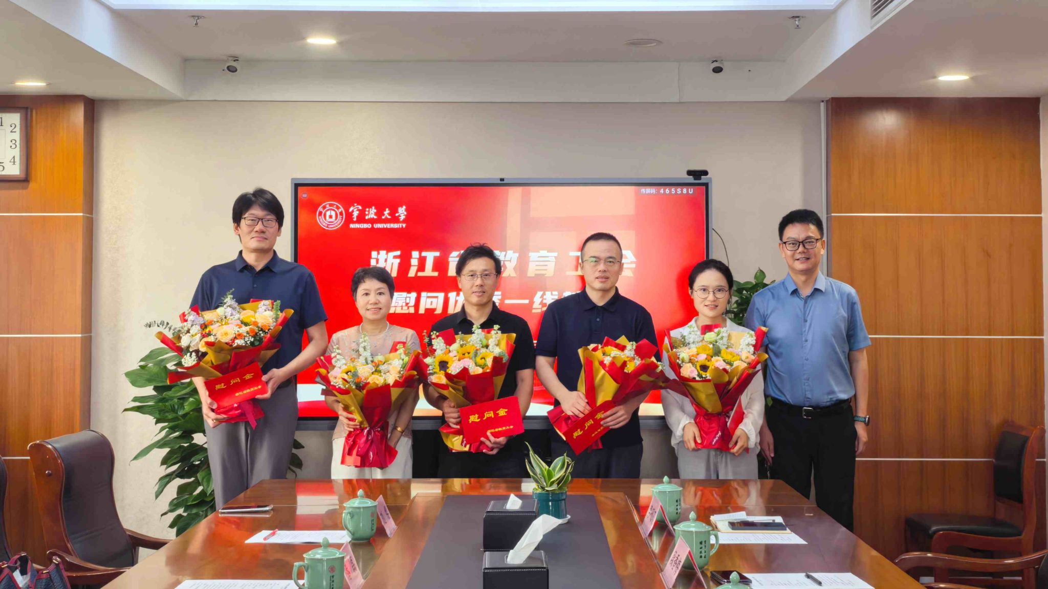 随后,潘磊与5位教师代表逐一握手并赠送鲜花,将工会组织的温暖与关怀切实送到一线教师心坎上。据悉,此次受到慰问的一线教师代表有:浙江省劳动模范李砚硕教授,浙江省三育人先进个人段香梅研究员,浙江省三育人先进个人王亚军教授,第五届全国高校青教赛思政专项组二等奖获得者、浙江省三育人先进个人郑善庆副教授和第六届全国高校青教赛文科组二等奖获得者徐入云副教授。
